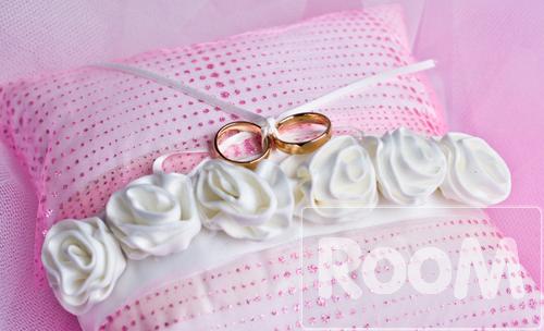 Double gold rings tied on a pink pillow with white roses