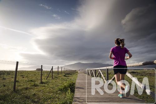 Young girl running in the wooden pasarelaof the natural park in Tarifa, Cadiz, Andalusia, Spain