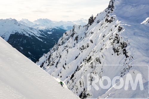 A young man skiing on powder snow in the backcountry of the Arlberg region in the Austrian Alps.