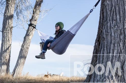 Woman sitting in blue hammock while camping