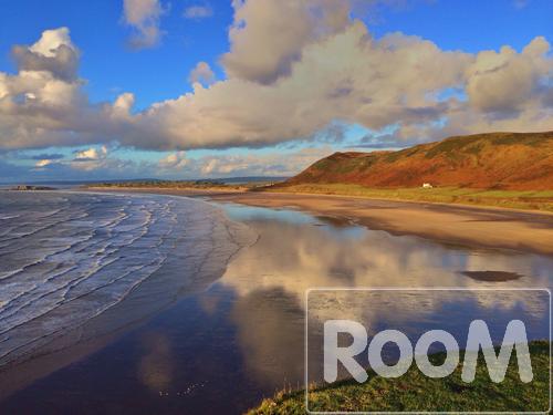 Dramatic sky with Cloud reflections on an empty sandy beach, Rhossili Bay, Gower, Wales, UK