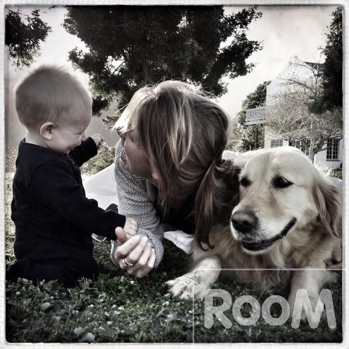 Mother, baby son and golden retriever dog sitting on lawn