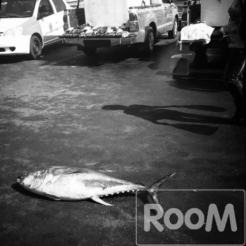 Yellowfin tuna lying on ground outside a fish market, Muscat, Oman