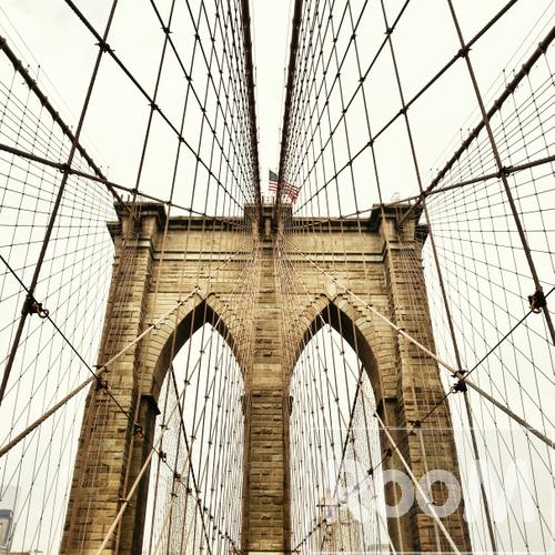 Low angle view of an American flag on Brooklyn Bridge, New York, USA