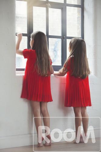 Two little girls in red dresses looking out of the window.