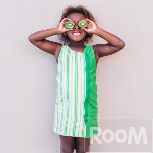 Smiling girl in green dress holding kiwi fruit in front of her eyes