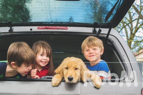 Three smiling children sitting in the boot of a car with their new puppy, USA
