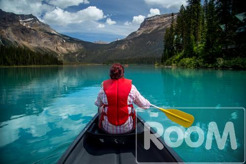 A woman in red jacket is paddling calm emerald lake waters.