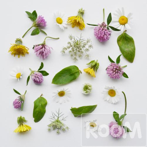 A pretty collection of scattered wildflowers on a white background. Clover, daisies, dandelion and queen Anne's lace.