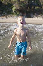 Boy standing in ocean laugh... -