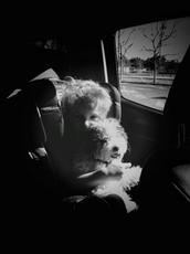 Boy and his puppy in the car -