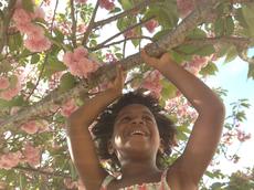 Girl holding branch of blos...