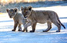 Lion cubs crossing the road -