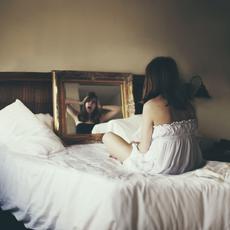 Woman sitting on bed lookin... #27777 -