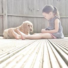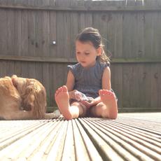 Girl sitting on decking wit... -