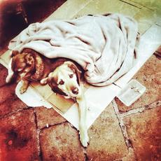 Two homeless dogs lying und... -