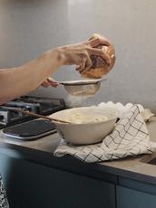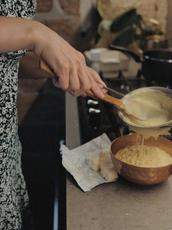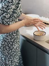 Woman cooks homemade food -